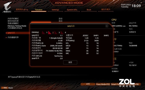 超频界面可以进行内存XMP设置或者内存超频,并且技嘉在BIOS集成内存SPD信息查看,便于超频设置。