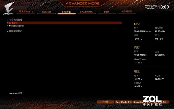 高级菜单可能调校查看其他硬件状态,CPU核心以及PCIe通道也能在这里设置。