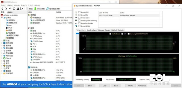 最后我们进行拷机测试,测试软件为AIDA 64,测试项目为负载最大的FPU单拷。