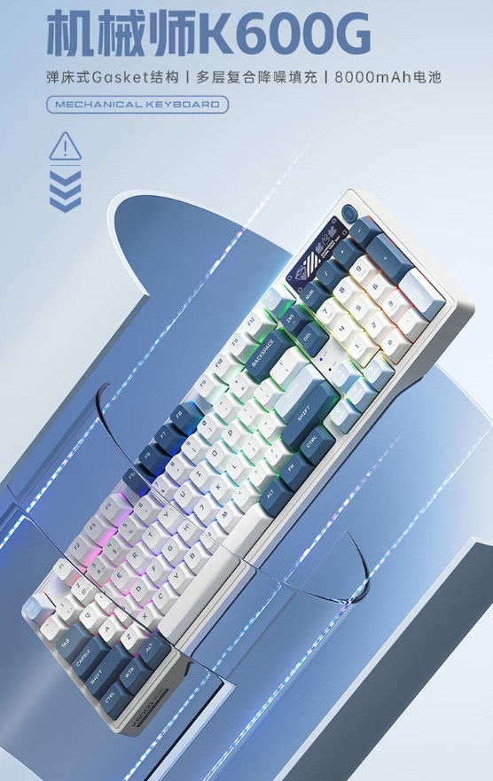 机械师 K600G机械键盘,首发定价299元。这款键盘采用了弹床式Gasket结构,结合多层复合降噪填充,为用户带来更加稳定的敲击感受和出色的降噪效果。
