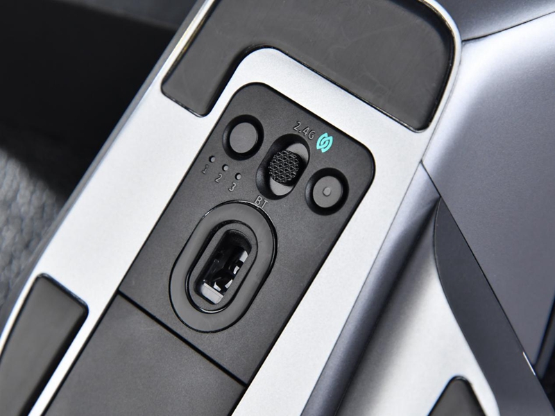 鼠标底面则看起来很常规,无非就是电源拨动开关,用于开机关机以及切换星闪和蓝牙模式。两枚按键一枚切换设备,另一枚则可切换dpi或设置自定义功能。下面就是一个方形磁吸的盖板,里面藏着无线充电用的金属触点和……另一个星闪接收器?!