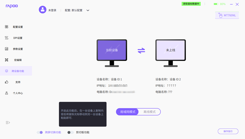 在星闪接收器模式下,雷柏通过自研的M+无线跨屏传输技术,可实现光标在两台设备间随时跨屏切换,也为无线传输文件、图片、文字等内容提供了空间。将雷柏 MT760NL多模无线星闪鼠标所提供的2枚接收器分别插在两台电脑上,并下载雷柏官方驱动,配对后即可开启无线跨屏功能。