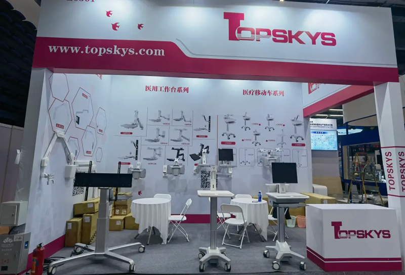 作为本次展会的参展商之一,TOPSKYS专注于医疗推车、摇臂支架的研究与制造,为IVD设备提供了高效的支臂解决方案,已为各大医院、康复中心及半导体工业设备提供了完善的支持,涵盖专业远程医疗、会诊工作站,移动查房、护理工作站,手术麻醉机支架,重症监护系统机械臂摇臂,以及监护仪、呼吸机台车支架等设备显示器支架电脑解决方案服务。