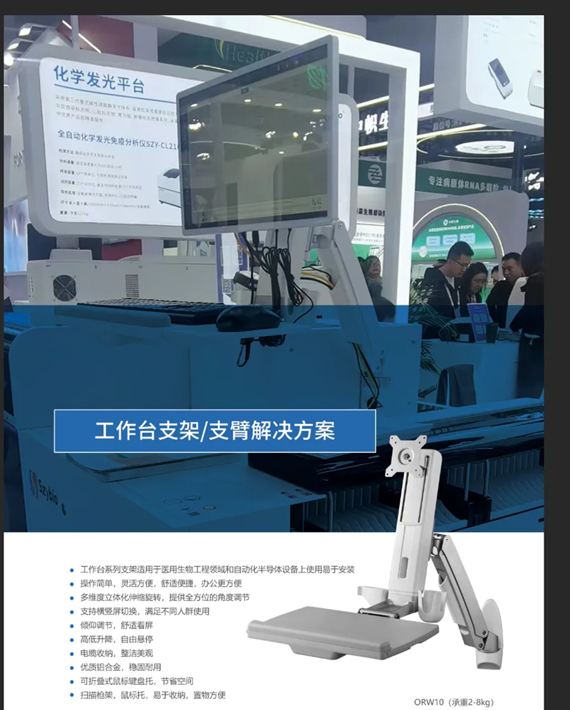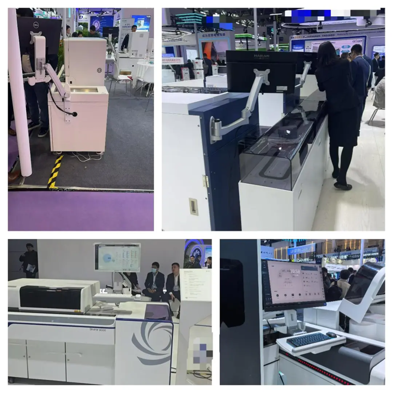 TOPSKYS的显示器支架工作台采用工程用橡胶和铝挤工艺打造,具有释放空间、多功能调节等核心功能,为IVD设备提供了高效的支臂解决方案,灵活的显示器及键盘调节设计,可适配CACLP展会中绝大多数分析仪、发光仪以及医院科室的麻醉机等产品。