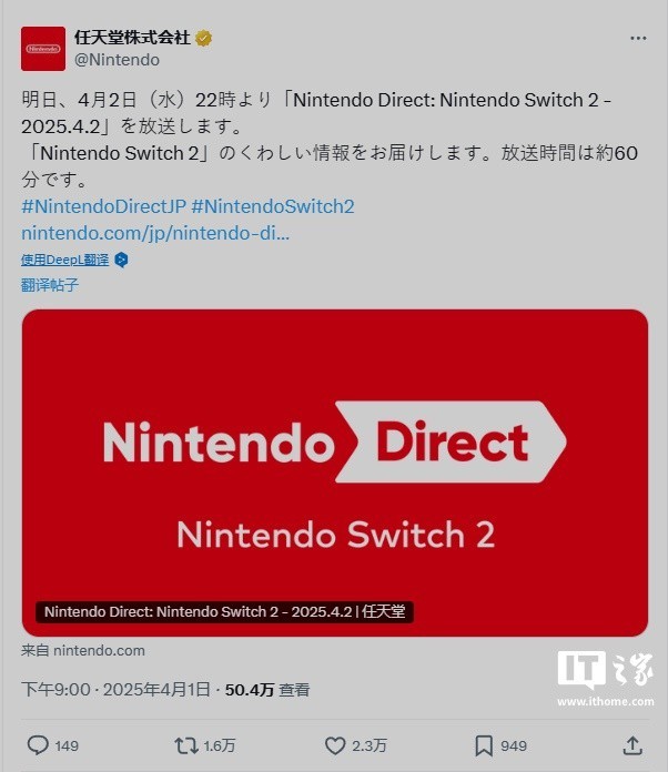 感谢热心网友提供的线索。据最新消息,任天堂计划于北美东部夏令时间4月2日上午9点(即北京时间4月2日晚上9点)举行一场关于Switch 2的直面会活动。官方已确认此次直面会的时长为60分钟。