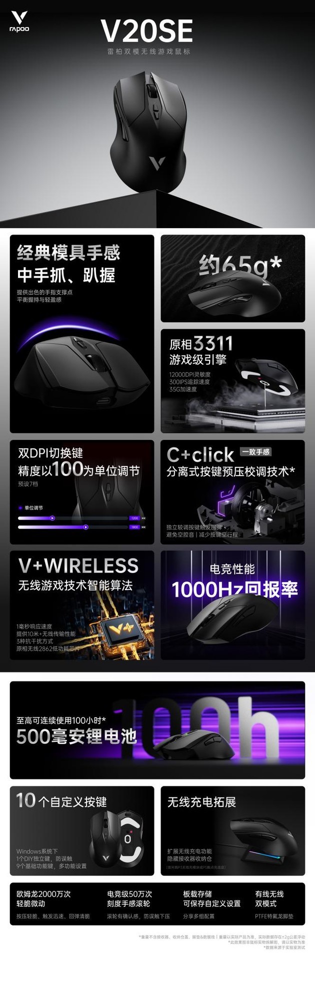 500毫安大容量锂电池,至高连续使用100小时,同时鼠标底部设计充电扩容仓,支持无线充电拓展,游戏不间断,持久战斗力全天候在线!雷柏V20SE双模游戏鼠标内核再度强上加强!