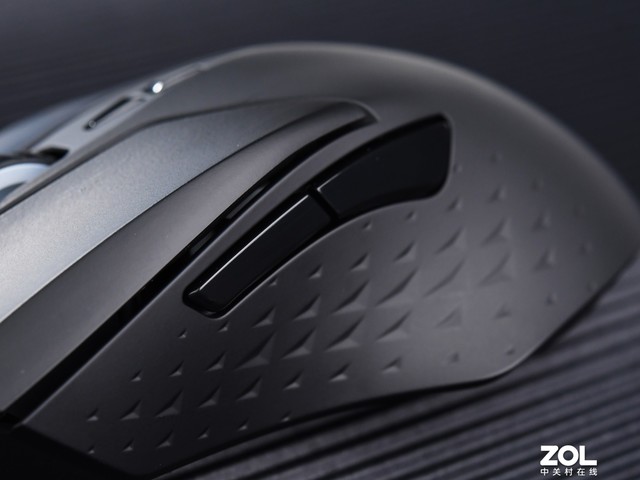 雷柏 V20W在左侧提供两枚镜面材质侧键,位置布局适中,手感轻盈干脆,并且有很高的一致度,没有发软问题。两枚侧键微微凸起,可以为我们带来很好的盲按操作体验,配合稍长的键程也能减少误触情况的发生。鼠标的侧裙加入了防滑纹理,有着很不错的摩擦力,不论是趴握还是抓握均可保持牢固的握持体验,不会发生打滑现象。