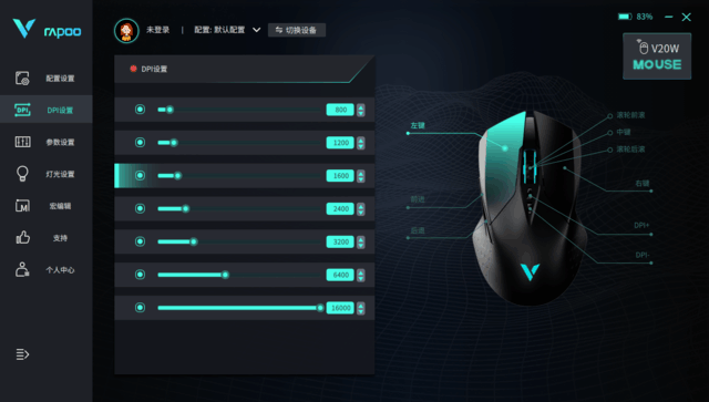 雷柏 V20W依旧支持雷柏官方驱动,通过驱动软件,我们能够调节DPI数值、按键功能、灯效模式并录入宏命令。它的驱动页面逻辑比较简洁,所有常用功能设置都在第一界面上,而无需繁琐的查找。它的DPI页面支持DPI档位、数值调整,可支持以50DPI为步进进行调节,最高可设置到16000DPI。