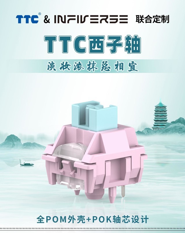 TTC 西子轴,采用全POM外壳+POK轴芯方案,POK材质拥有超耐磨低噪音的特性,POM拥有自润滑特性,因此,这个方案在顺滑度和声音表现都有非常好的表现。