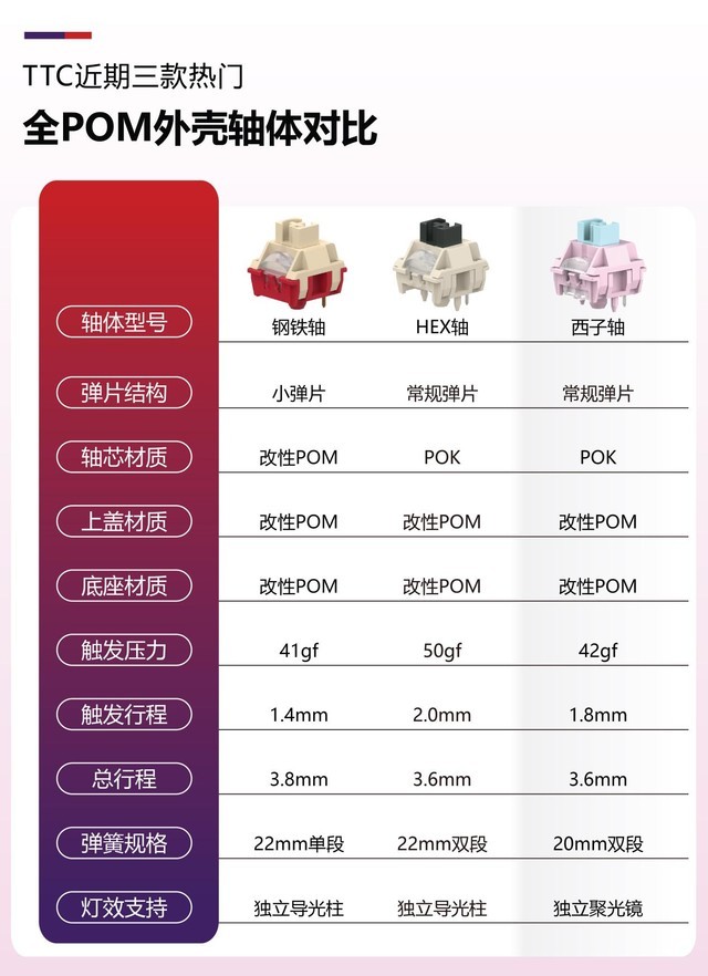 为方便用户选购,我们将近期三款热门全POM外壳轴体的规格参数做一个对比。