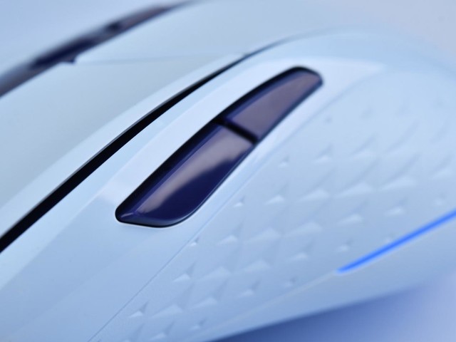 雷柏 V300W鼠标左侧提供2枚侧键,它们的位置适中,手感的一致度也不错,回弹清脆迅速,并且位置合理,不易误触,在玩游戏的时候能够提供不错的体验。另外,鼠标的侧裙部分采用了镜面+磨砂两种工艺处理,磨砂区域还设置了防滑纹理,手指抓握区域还做了内收设计,可以让我牢牢抓握住,不会在使用的时候出现机身打滑的问题。