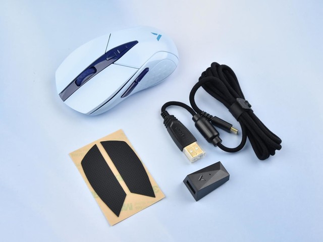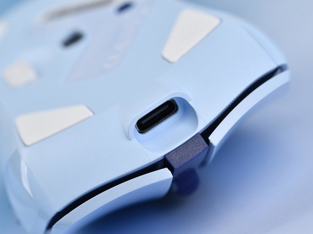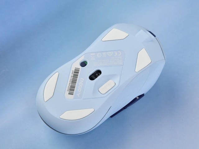 雷柏 V300W鼠标底部提供了4块大面积特氟龙材质脚贴,另外,鼠标的2.4GHz无线接收器收纳槽和电源开关均设计在底部。这款鼠标的前部还设置USBType-C接口,可以支持充电和有线连接,配合附送的伞绳,也能够带来束缚度极低的0信号传输延迟操作。