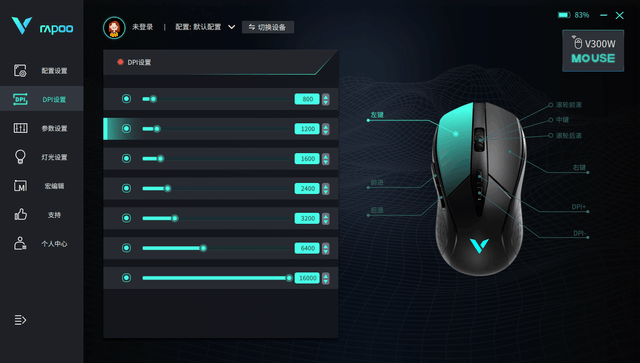 雷柏 V300W双模无线游戏鼠标搭载原相3335,分辨率范围50-16000DPI,并支持以50DPI为档位的自定义7档DPI,预设档位:800/1200/1600/2400/3200/6400/16000DPI,在常用档位下都能做到精准的循迹表现。