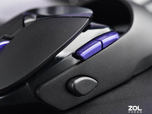 雷柏VT950PRO左侧与雷柏 VT960PRO侧键布局也不一样,左侧和右侧各有两个紫色按键,左侧为前进后退按键,右侧为两个自定义按键,通过驱动调节的话,雷柏VT950PRO鼠标会有11个可编程按键,比雷柏 VT960PRO多两个。