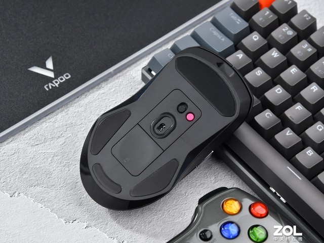 鼠标底部提供物理开关以及一个粉色自定义DIY按键,默认为DPI切换,可以通过雷柏RapooGameDev软件进行自定义,驱动更新后可以支持一键切换回报率或者接收器切换,在底部也防止了误触。