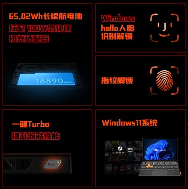 预装游侠X1 widows 11系统游戏资源丰富,可以为各种办公软件的运行提供更好的支持;机身顶部的电源按钮集成指纹解锁功能,可以通过触摸快速登录系统。同时,屏幕顶部配备了AI摄像头,支持Windows。 Hello人脸识别解锁,在视频会议等领域也能给用户带来全新的体验。