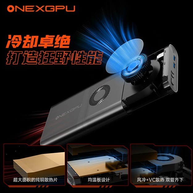 OneXGPU一号图形卡采用传统的风冷+VC均温板组合散热方式,支持一键式Turbo热切换功能,默认功耗100W ,一键Turbo到满血120W可以获得更极端的游戏体验;同时,它还支持100W反向供电,足以满足大多数轻型设备的供电需求。