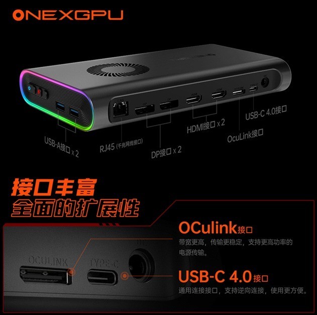 OneXGPU机身采用6000系航空铝,采用180玻璃砂喷砂阳极氧化着色工艺,配备双RGB环形尾灯,可改变多达16种不同主题风格的颜色,酷RGB战斗氛围灯,可为您的游戏空间增添更多个性化元素,创造自己的电子竞技空间。
