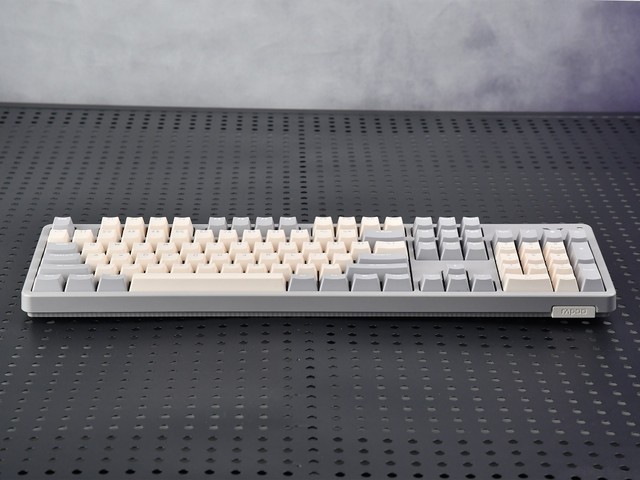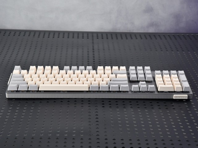 在细节方面,键盘前右下角有一个凸起,上面印有雷柏的标志。键盘左侧也有凸起设计,表面有斜纹处理。这部分是单独的颜色匹配,“双重拼写”版本是颜色之一,月光白版本是浅蓝色,黑曜石黑版本是亮绿色。这种装饰使键盘在视觉上有一定的层次感。