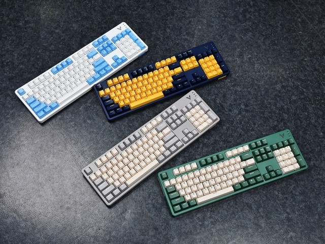 雷柏 V500PRO 2024版采用了全新的104键外观设计,共提供了6种配色方案,我们都得到了。有点遗憾,雷柏 V500PRO2024版提供了五种雷柏独立机械轴。在我们得到的六个键盘中,只有三个,我们没有体验到所有轴的感觉。