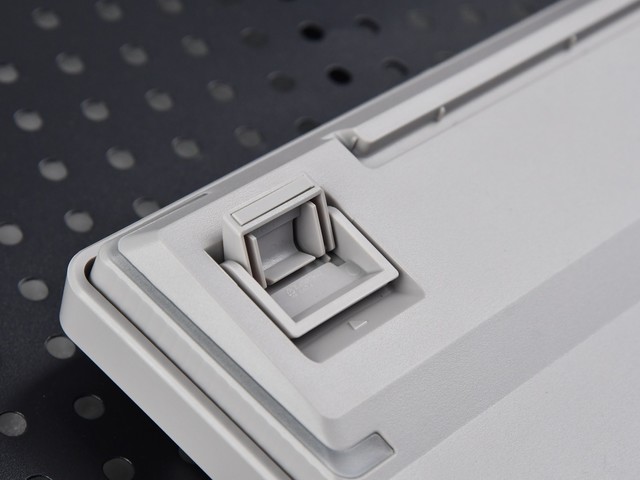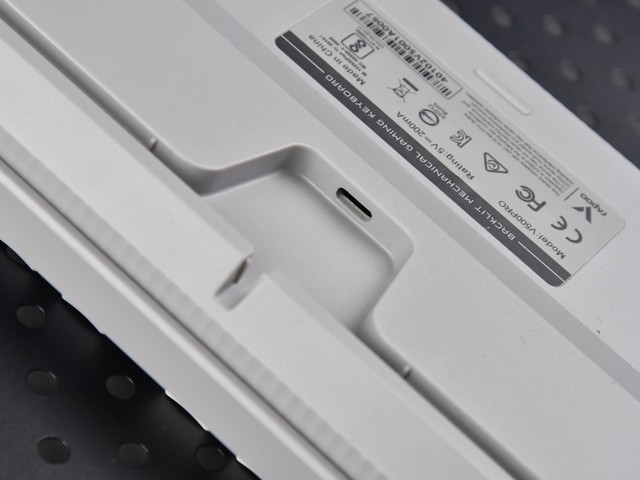 来到键盘底部 雷柏V500PRO 2024版电线采用分离式,键盘侧接口为USB。-C,PC侧接口为USB-A。底部为线材预留了三个方向的槽位,提供了左、中、右三种出线方式,比较灵活,能满足不同用户的理线需求。