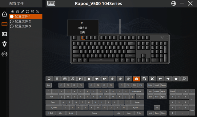 默认情况下,配置文件功能提供3个,用户可自由添加或删除。Fn+默认情况下,F1-F12提供了12种多媒体快捷功能,基本上所有常用的功能都被覆盖。软件除了12种多媒体快捷功能外,还提供了7种浏览器快捷功能,必要时可以自行设置。当然,用户可以定制除Fn以外的任何按钮,设置宏和功能键,例如一键复制,或者一键最小化所有窗口,或者一键通过设置的宏来实现多步操作。