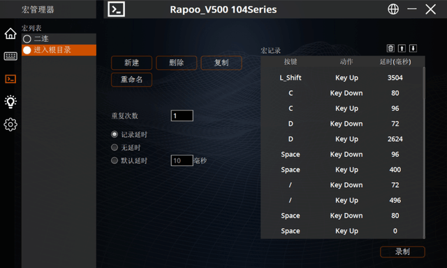 得益于雷柏 V500PRO2024版本具有板载存储功能,因此它不仅支持103键(FN除外)的可编程性,还支持固件升级。该软件还提供了相应的操作,用户有很大的定制空间。另外,对于依赖组合键的用户来说,V500PRO2024版本也支持全键位置无冲突。