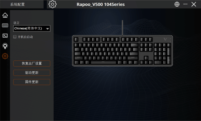 雷柏 V500PRO 2024年版本支持固件升级,因此在系统配置中,除了提供启动自启动、恢复出厂和驱动更新外,还提供了固件更新功能。后续官方可以通过这种方式增加新功能,或者提高键盘的性能。