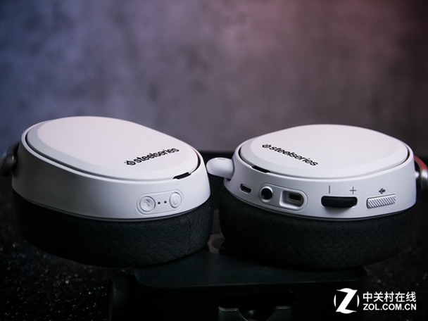 功能区分布在左右耳机单元的下方,相比于Arctis Pro + GameDAC,此次多了一个开机键和蓝牙按键,2.4G模式时白色灯亮起使用蓝牙连接时则亮起蓝灯。