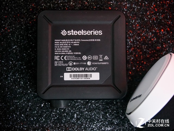 无线接收器采用了正方形的设计,四角采用了圆弧形的倒角处理,四边镜面材质的设计很显质感,但也是指纹收集器,同样有两个塑胶材质的按钮,维持了Arctis Pro + GameDAC按钮的手感,紧绷不松散,后部则为各种接口注有说明,简洁易懂,底部除了橡胶底座以外还有闪闪的杜比认证。