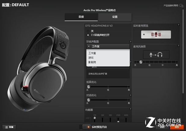 赛睿 Arctis Pro Wireless支持无线声卡接收器和驱动调节两种方式,都十分简便,可以调节的选项也非常多,新一代的DTS环绕音效、低音优化、对话优化、均衡器、以及麦克风侧音等等,非常细化,我们可以看到,虽然作为一款游戏耳机但它也兼顾了影音体验,并没有做一个偏科生。