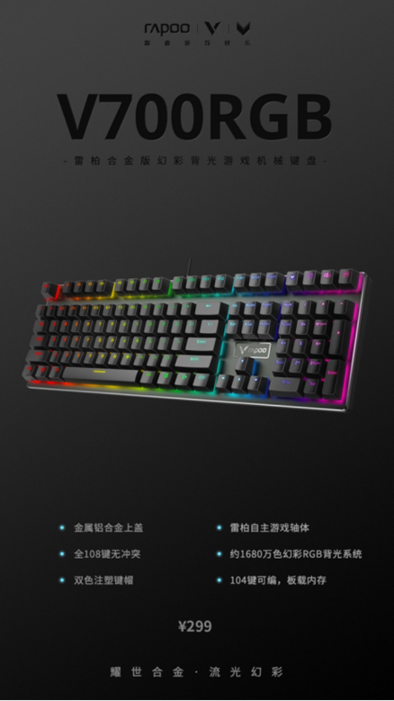 RAPOO雷柏,领军国产外设品牌,实力大厂上市企业发布的V700RGB合金版幻彩背光游戏机械键盘,1680万色的幻彩RGB背光系统,19种的灯光模式,并支持单键背光可独立设置。金属的铝合金上盖,全键无冲突,全键可编程等诸多亮点集一身的雷柏 V700RGB合金版,强大的驱动软件也让键盘的可玩性获得更大的提高,售价仅为299元,相信它一定会成为你首选的游戏利器,给你畅快的游戏操作体验。