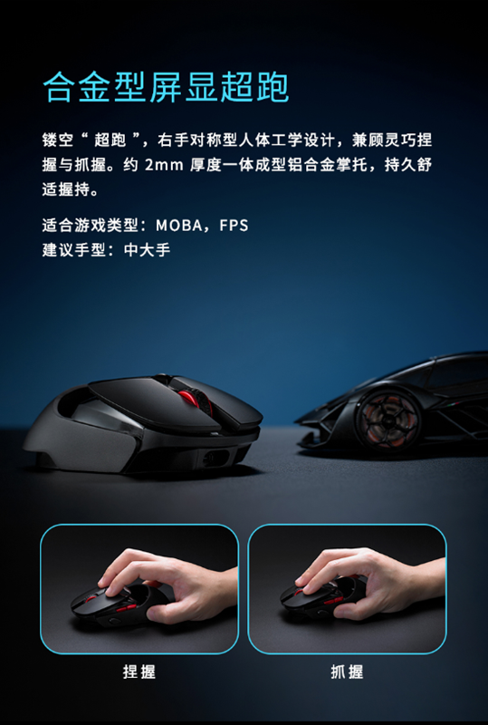 雷柏 VT960S镂空超跑造型,右手对称的人体工程学设计,适合握手和抓手的中大手玩家,也适合MOBA和FPS竞技游戏。鼠标整体手感圆润光滑,后半部分采用厚度约2mm、高强度的铝合金材质,采用细磨砂工艺处理,具有天然冰感,防滑防汗,持久保持干燥舒适。