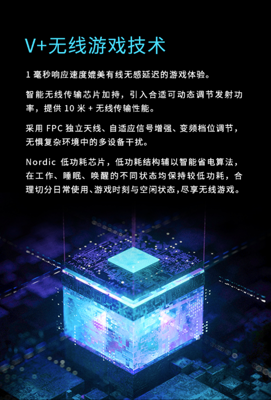 以技术研发为核心,以市场需求为指导,凭借强大的研发实力,独立开发定制雷柏轴、雷柏微动、游戏芯片等核心产品部件。Qi无线充电、OLED显示屏、防水防尘、板内存、云存储等个性化功能,解决了玩家需求的痛点。V+无线游戏技术提高了优化电池寿命、低延迟、抗干扰、使用距离,探索了电子体育的未来。
