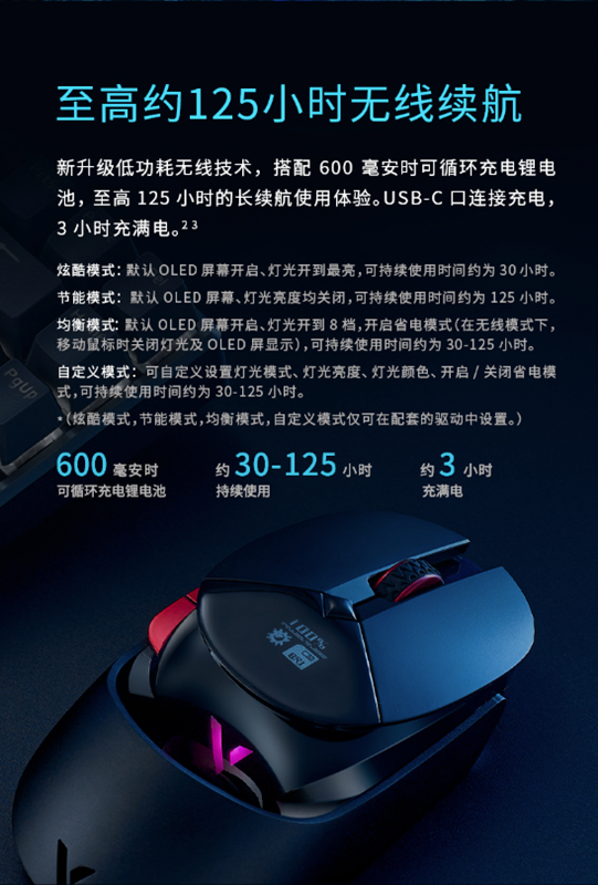 新升级的低功耗无线技术在600毫安锂电池下为鼠标带来了至高125小时的长寿命体验。USB-C连接充电接口,3小时充电,开启超长的无线游戏体验。