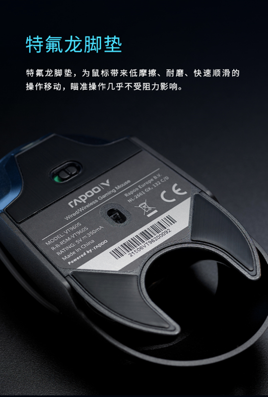雷柏 VT960S特氟龙脚垫,给鼠标带来低摩擦、耐磨、快速流畅的操作移动,瞄准操作几乎不受阻力的影响。
