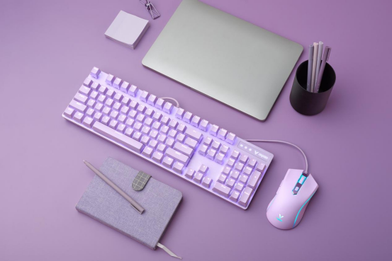 雷柏 V28S幻彩RGB电竞游戏鼠标清紫,雷柏 V500PRO清紫机械键盘,雷柏 VH650游戏耳机清紫,用色彩向我们诠释更加多样化和个性化的游戏空间。