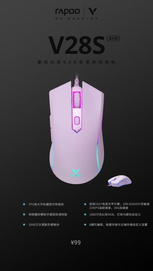 俗话说,装备越紫,操作越猛。清凉跳动的清紫,百变酷炫的RGB灯光,凭借默契配合和稳定发挥,全力竞圈。最高6200DPI,7档DPI快速切换,准确捕捉每一个细微操作,FPS大手鼠标再添一员!雷柏 V28S幻彩RGB电竞游戏鼠标清紫上市!