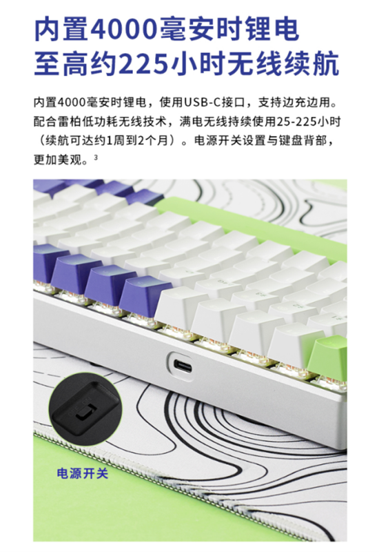 雷柏 V700-8A机甲紫内置4000mah高能锂电池,配合雷柏低功耗芯片和节能节能技术,全电源无线连续使用25-225小时,续航时间可达1周至2个月左右,避免频繁充电的麻烦。