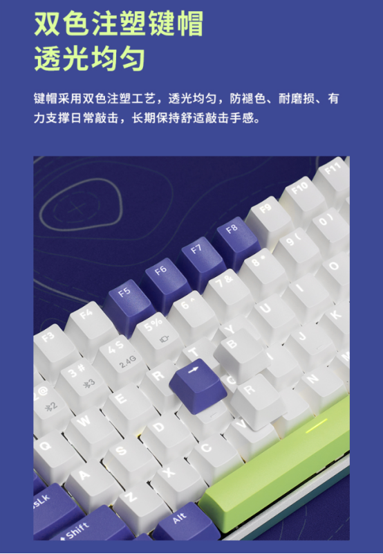 钥匙帽采用双色注塑工艺,透光均匀,抗褪色,耐磨,有力支撑日常敲击,长期保持舒适的敲击感。