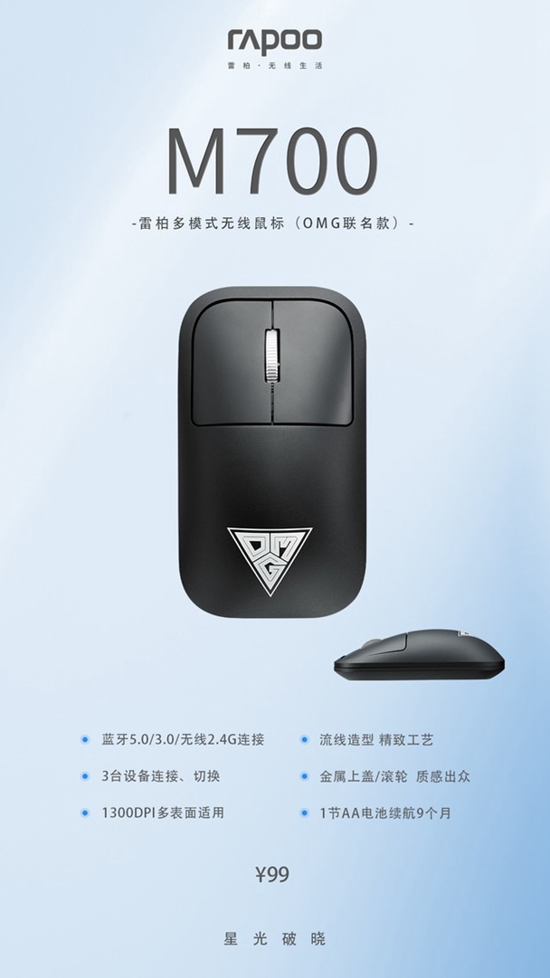 官方公告雷柏游戏XOMG电子竞技俱乐部英雄联盟团队,以星光黎明为特色,10周年特别礼物,雷柏 M700多模无线鼠标和游戏鼠标垫联名,提炼OMG档案中的经典元素,为游戏与现代生活的融合带来新的诠释。