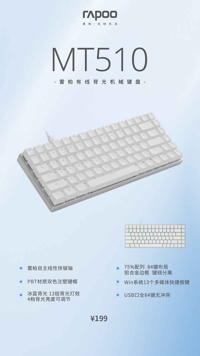 雷柏高端商务办公系列MT一直以打造现代时尚美观的办公桌面产品而闻名。此外,在简约风格的设计上,雷柏 MT510 PRO主题色产品再次推出雷柏 MT510有线背光机械键盘,75%配置,84键位置,雷柏自主线性快银轴,PBT双色注塑键帽依然保持键盘,给人视觉和轻触感的双重享受。
