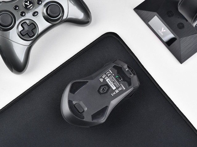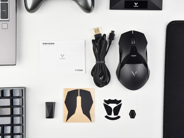 雷柏 VT950S电竞游戏鼠标采用对称手型设计,其尺寸约为74mmx129.3mmx40mm,属于中手偏大型鼠标。在外观设计上,这款鼠标采用了分体式设计,具有较大的视觉冲击力。雷柏 VT950S的最大宽度比我们熟悉的罗技G903增加了9mm,宽大的尾巴能给手掌带来更充实的填充感,而较高的背拱对抓握姿势十分友好。