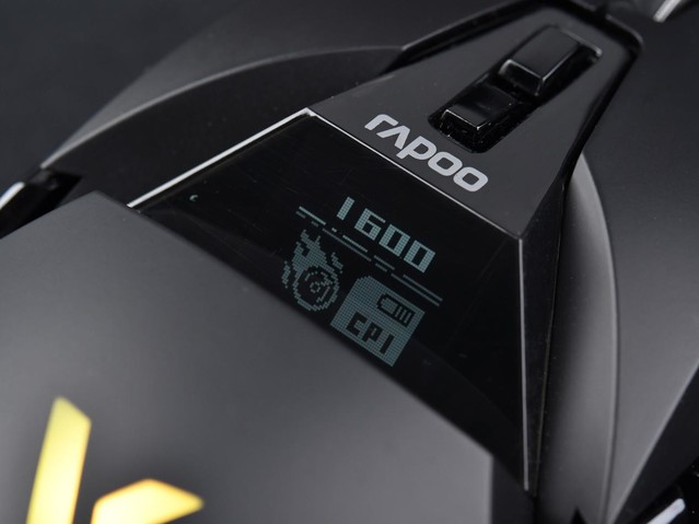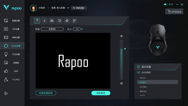 在鼠标正中央设置了VT950S显示屏,可显示静态文字、鼠标参数和BMP格式的单色图片,其尺寸为0.66英寸,最大分辨率为64x48像素的图片可显示。在雷柏 VT系列中,鼠标预设的图案是LOGO,并且可以直观地显示鼠标当前的DPI档位。