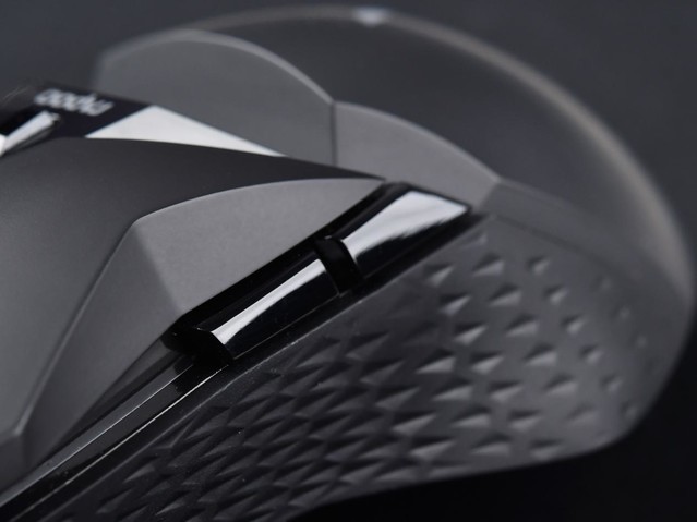 鼠标的DPI键采用电镀工艺的ABS材质,触感光滑,可以为鼠标调节合适的分辨率。此外,鼠标左右两侧各有两个侧键,侧键材质与DPI键相同。按钮手感坚韧,回弹整齐,没有任何空键程。这些侧键的默认功能是前进/后退,个性化指令可以通过驱动定制。完全对称的设计可以让左右手使用的用户获得同样的体验,适用范围还是很广的。