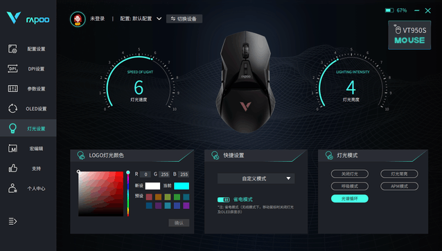 我们也可以通过驱动设置来调节鼠标的照明循环模式,但是可调节的模式只有呼吸灯和光谱循环,还是比较少的。VT950S照明区域只有尾部的双色注塑LOGO,在酷炫程度上还是有点差。