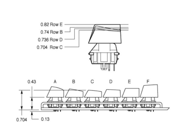从键盘的上方数到下方总共会有6列,倾斜角度由上而下通常为R4、R4、R3、R2、R1、R1,将有些键帽翻过来看就会看到这些注记。至于还有一种更高的R5高度,这在目前键盘中算是极少见。另外,有些玩家对于键盘倾斜高度的说法是反过来叙述,由上而下变成R1、R1、R2、R3、R4、R4,虽然数字不同,但代表的意义并无不同。