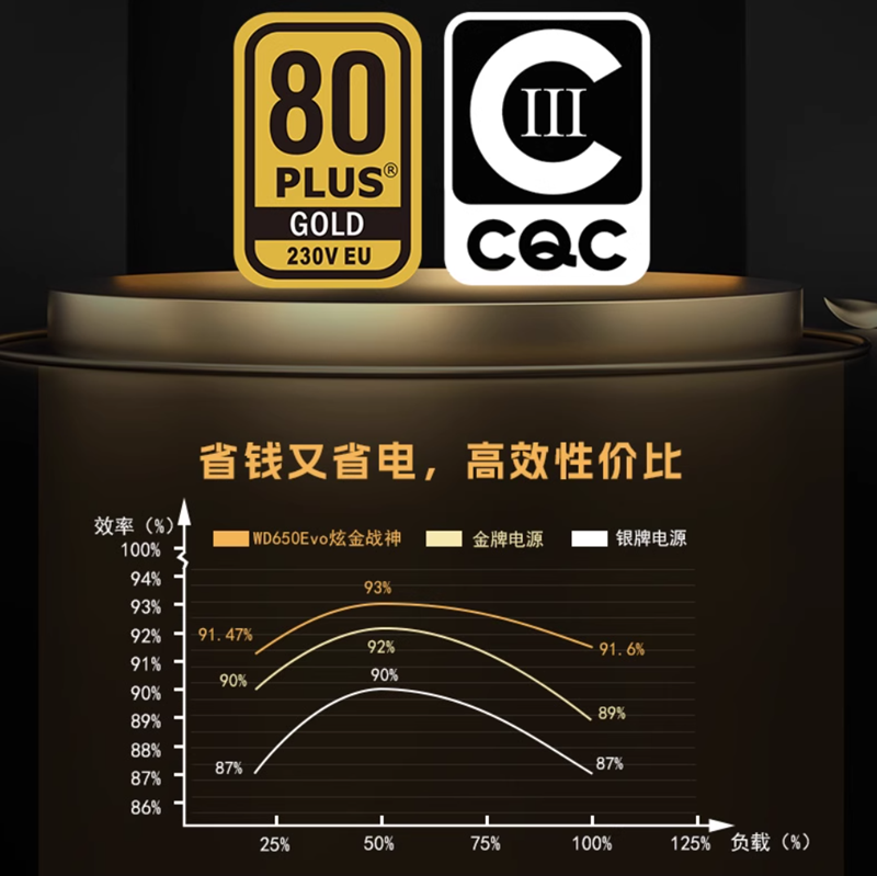 航嘉 WD650Evo炫金战神隶属于航嘉经典且久经考验的WD系列,是一款用料非常不错的宽幅游戏电源。最引人注目的,就要数其通过了80PLUS金牌认证,在230V电压下的转化率非常给力,50%负载下高达93%,超过了金牌电源标准。此外它还通过了CQC Ⅲ级能效认证,更能说明它的高转换效率优势。