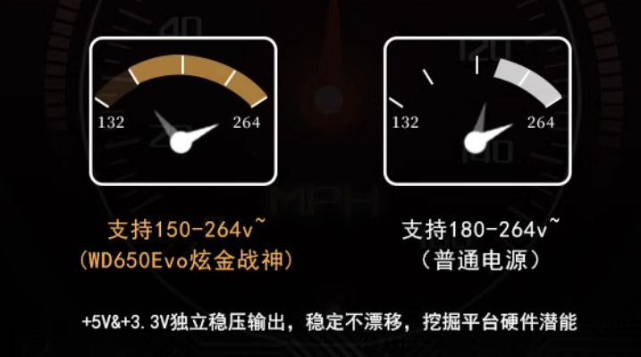 WD系列一直以宽幅电压支持闻名,航嘉 WD650Evo炫金战神也不例外。航嘉 WD650Evo炫金战神电压支持范围为150-264V,甚至典型负载下能支持到135V,而普通电源多为180-264V,差距明显。更宽幅电压的支持,可以有效应对部分特殊地区电压不稳定的情况,保证整机运行稳定。