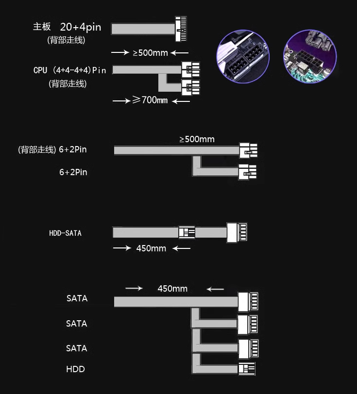 线材方面,航嘉 WD650Evo炫金战神采用直出设计,提供700mm的CPU供电线,方便走背线。主板供电线和双8Pin显卡供电线的长度也达到了500mm,对于机箱的兼容性也很不错。此外还有4个SATA供电线和2个大4PIN,完全可以满足用户连接各种配件的需求。